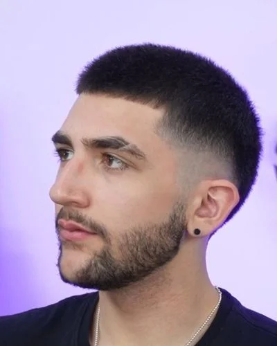 The fade starts high on the sides, close to the top of the head. Creates a strong contrast between the shaved sides and the length on top. A bold, sharp look that suits clients who want maximum impact.